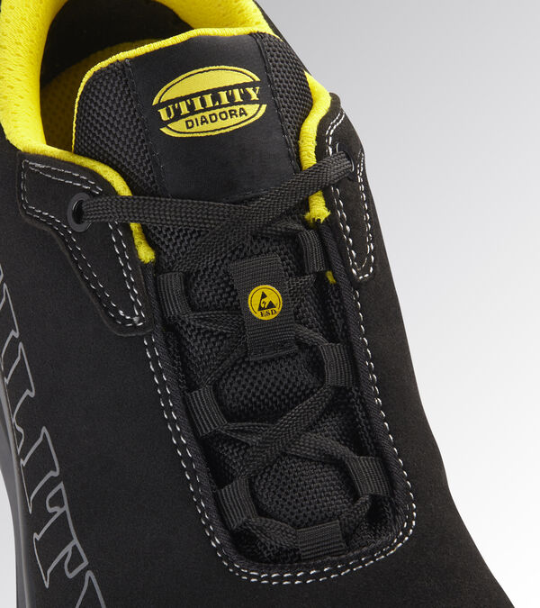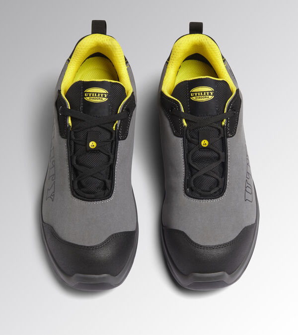 Niedriger Sicherheitsschuh S3L aus wasserabweisender Mikrofaser mit SOFTBOX-Dämpfungstechnologie. Zehenkappe Multilayer 200J. Passform 11. Futter aus 100 % Polyester mit rutschfester Mikrofaser. Herausnehmbare Einlegesohle aus PU-Schaum mit Polyester. Fersenschutz aus TPU. ESD und ohne Metall.