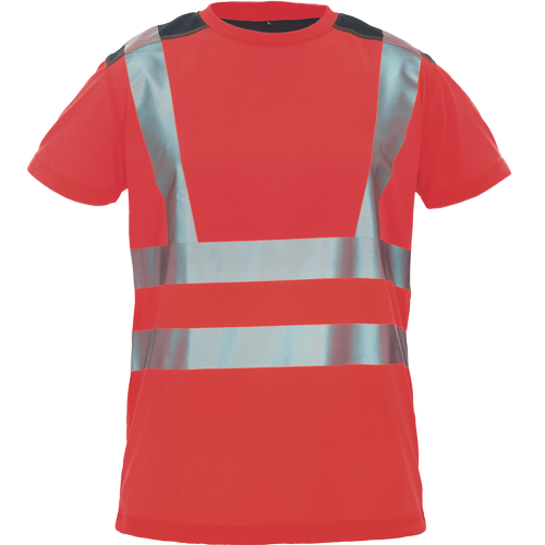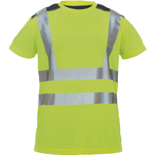 • Hi-Vis-T-Shirt aus leichtem Polyester-Single-Jersey • Kontrastsattel in schwarzer Farbe, gefüttert mit reflektierenden Paspeln • reflektierende, 5 cm breite, aufgepatchte Streifen um den Körper und über die Schultern • ZiernähteStandards