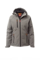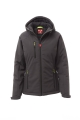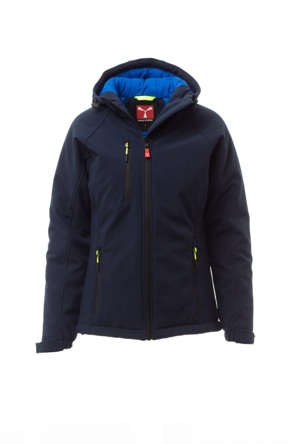 WP 8000 mm H₂O, MVP 5000 g/m² 24h. Damen-Softshell, 3-lagig, mit warmer Wattierung (160 g/m²), Reißverschluss mit „Semi-Auto-Lock“-Metallschieber und personalisiertem Schiebergriff. Feste Kapuze mit regulierbarem Kordelzug. Elastische Ärmelbündchen mit Klettverschluss zur Weitenregulierung. 2 Seitentaschen mit Reißverschluss und 1 Brusttasche mit Reißverschluss. Fluoreszierende Schiebergriffe. 2 Innentaschen: 1 geformte Tasche mit Reißverschluss und 1 Tablet-Tasche mit Klettverschluss. Regulierbarer Saum mit personalisierten Stoppern.