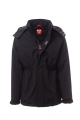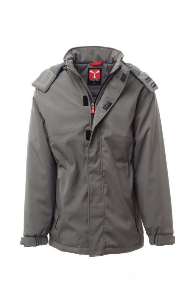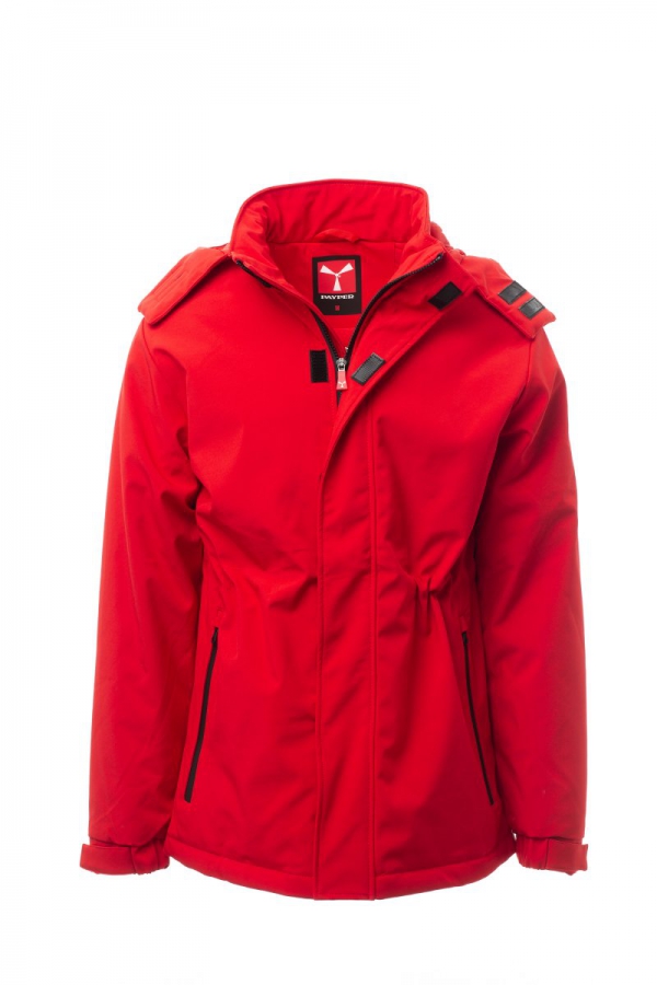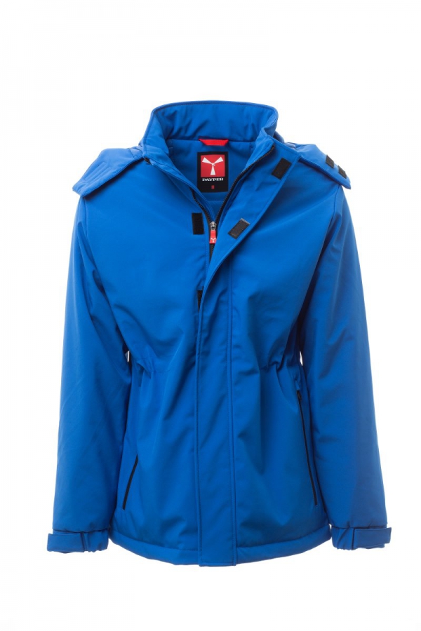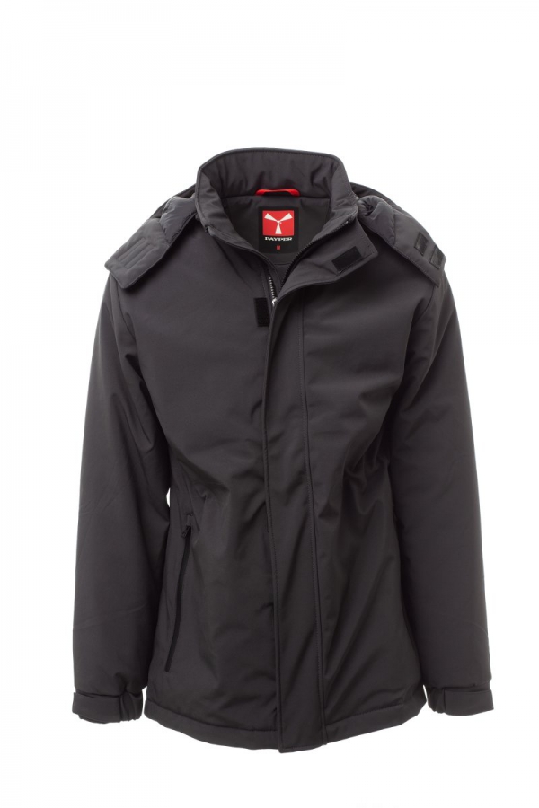 WP 8000 mm H₂O, MVP 5000 g/m² 24h. Herren-Softshell, 3-lagig, mit warmer Wattierung (160 g/m²), Klettverschluss und Reißverschluss mit „Semi-Auto-Lock“-Metallschieber und personalisiertem Schiebergriff. Kapuze abtrennbar und vorne mit Klettverschluss verschließbar. 2 Außentaschen mit beschichtetem Reißverschluss, 1 Innentasche mit Paspel und Klettverschluss, 1 Tablet-Innentasche mit Klettverschluss. Elastische Ärmelbündchen mit Klettverschluss zur Weitenregulierung. Personalisierter Aufnäher im Nacken mit reflektierendem Detail. Regulierbarer Saum mit personalisierten Stoppern.