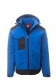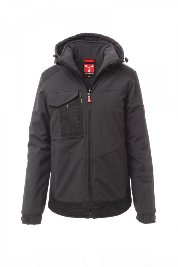 WP 8000 mm H₂O, MVP 5000 g/m² 24h. Wattierte Herren-Softshell, Kragen mit Fleece-Einsätzen, Reißverschluss mit „Semi-Auto-Lock“-Metallschieber und personalisiertem Schiebergriff. Abnehmbare, mit Kordelzug regulierbare Kapuze. Reflektierendes Band auf den Schultern. Elastische, mit Klettverschluss verstellbare Ärmelbündchen. Lock-System-Brusttasche mit Patte und Stifthalter. 2 Seitentaschen mit Reißverschluss. 2 Innentaschen, eine davon mit Tablet-Fach, das mit Klettverschluss geschlossen wird, und eine Formtasche mit Reißverschluss auf der rechten Brust. Verstellbarer Saum mit personalisierten Stoppern und reflektierender Paspelierung auf dem Rücken.