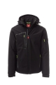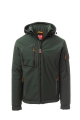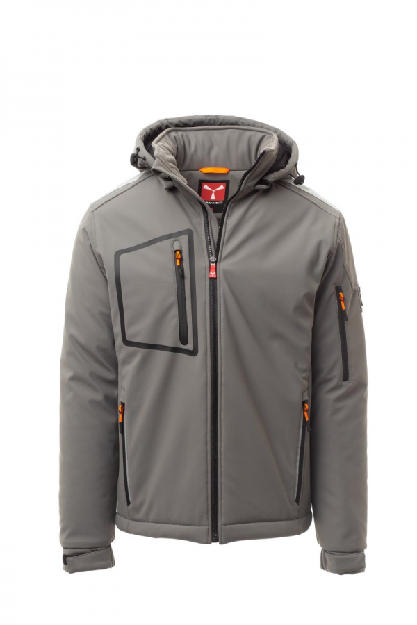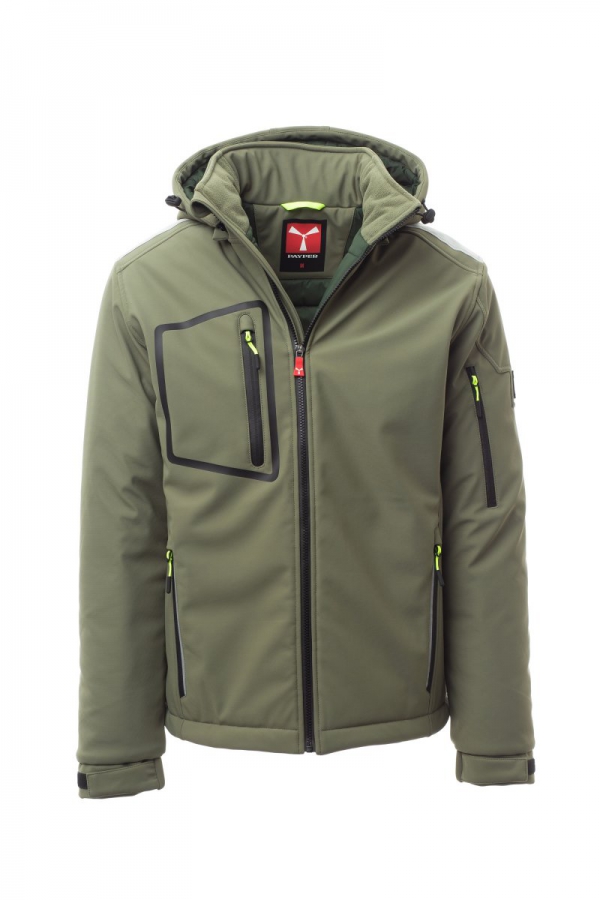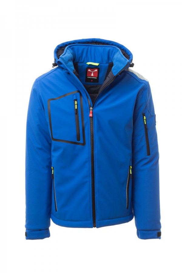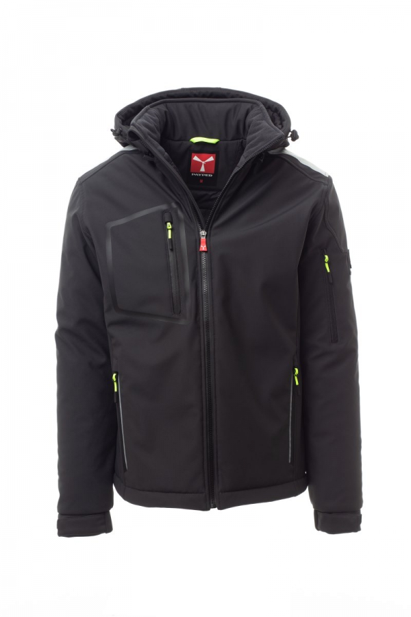 WP 8000 mm H₂O, MVP 5000 g/m² 24 h. Herren-Softshell, 3-lagig, mit warmer Wattierung (160 g/m²), Kragen mit Fleece-Einsätzen, SBS-Reißverschluss mit „Semi-Auto-Lock“-Metallschieber und personalisiertem Schiebergriff. Abtrennbare Kapuze mit regulierbarem Kordelzug. Innenkragen mit seitlichen Fleece-Details. Reflexstreifen auf den Schultern, im unteren Rückenbereich und auf der Rückseite der Kapuze. Elastische Ärmelbündchen mit Klettverschluss zur Weitenregulierung und Innenstulpe. Thermoverschweißte Brusttasche mit versiegeltem Reißverschluss. 2 Seitentaschen mit Reißverschluss mit reflektierendem Detail. 1 Tasche mit Reißverschluss und integriertem Stifthalter auf dem linken Arm. Fluoreszierende Schiebergriffe. 2 Innentaschen: 1 geformte Tasche mit Reißverschluss an der rechten Brust und 1 Tablet-Tasche mit Klettverschluss auf der linken Seite. Regulierbarer Saum mit personalisierten Stoppern.