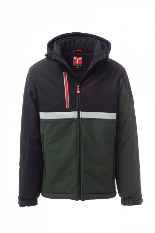 WP 8000 mm H₂O, MVP 5000 g/m² 24 h. Herren-Softshell, 3-lagig, mit warmer Wattierung (160 g/m²), Kragen mit Fleece-Einsätzen, SBS-Reißverschluss mit „Semi-Auto-Lock“-Metallschieber und personalisiertem Schiebergriff. Abtrennbare Kapuze mit regulierbarem Kordelzug. Reflexstreifen vorne auf Brusthöhe. Elastische Ärmelbündchen mit Klettverschluss zur Weitenregulierung und Innenbündchen. 2 Seitentaschen mit Reißverschluss und 1 Brusttasche mit Reißverschluss mit reflektierendem Detail. „Life-Saving“-Element auf der Rückseite mit reflektierendem Firmenschriftzug auf der Innenseite und Reißverschluss. 2 Innentaschen: 1 geformte Tasche mit Reißverschluss an der rechten Brust und 1 Tablet-Tasche mit Klettverschluss auf der linken Seite. Regulierbarer Saum mit personalisierten Stoppern.