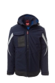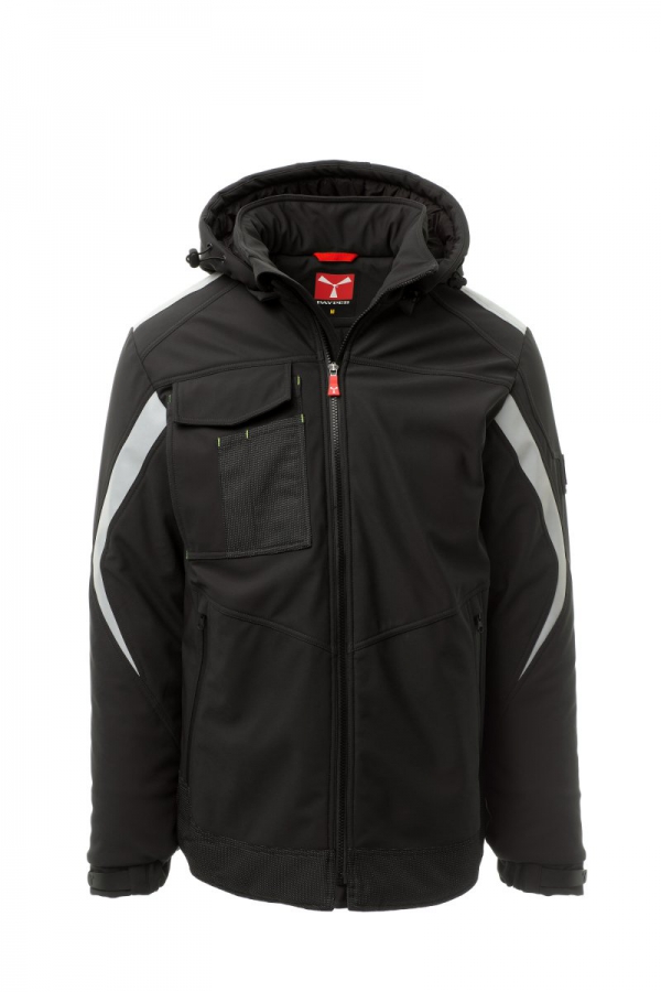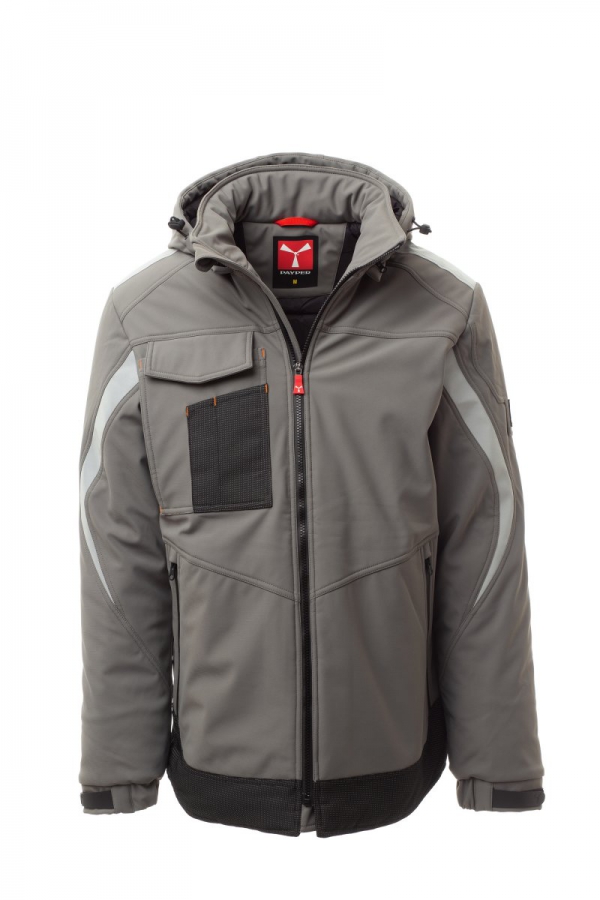 WP 8000 mm H₂O, MVP 5000 g/m² 24 h. Wattierte Herren-Softshell, SBS-Reißverschluss mit „Semi-Auto-Lock“-Metallschieber und personalisiertem Schiebergriff. Abtrennbare Kapuze mit regulierbarem Kordelzug. Reflexband auf Schultern und Armen. Elastische Ärmelbündchen mit Klettverschluss zur Weitenregulierung und Innenbündchen. Brusttasche mit Lock-System, Patte, Ausweishalter und Stifthalter. 2 Seitentaschen mit beschichtetem Reißverschluss. „Life-saving“-Element auf der Rückseite mit reflektierendem Firmenschriftzug auf der Innenseite, mit beschichtetem Reißverschluss. 2 Innentaschen: 1 Tablettasche mit Klettverschluss und 1 geformte Tasche mit Reißverschluss an der rechten Brust. Regulierbare Taille mit personalisierten Stoppern. Gepunkteter Stoff mit reflektierendem Effekt.