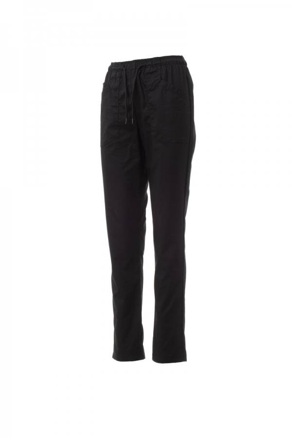 Multifunktions-Kochhose für Damen aus Baumwoll-Ripstop und Lycra® T400®, hervorragende elastische und atmungsaktive Eigenschaften. Bund: Kordel außen und elastisches Schweißband innen. Zwei geformte Vordertaschen und ein Münztäschchen. Eine aufgesetzte geformte Gesäßtasche und eine Tasche am Bein. Verstärkungen Ton-in-Ton.