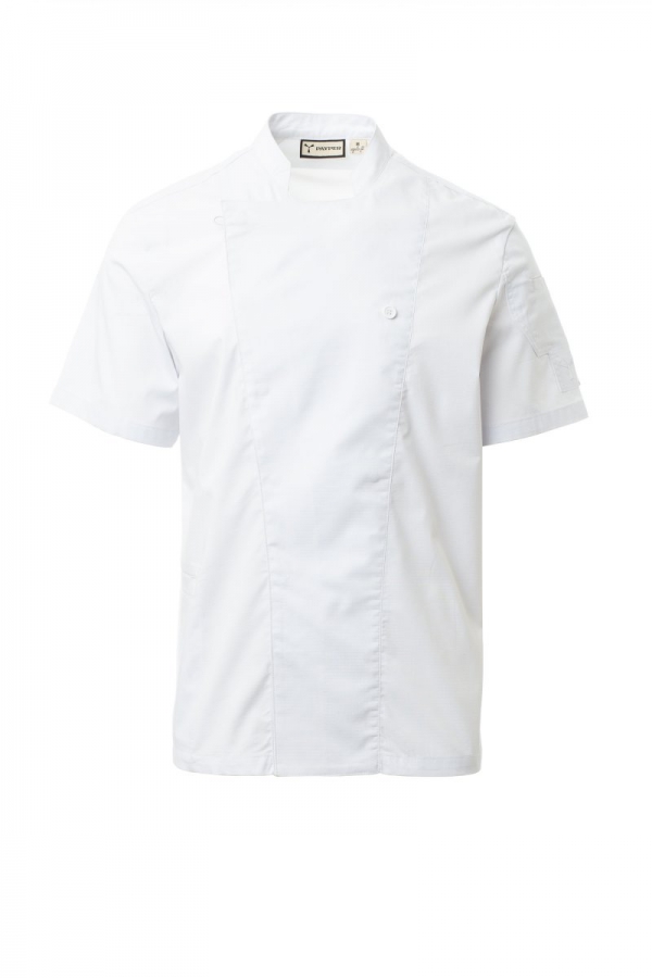 Kochjacke für Herren aus Baumwoll-Ripstop und Lycra® T400®, Mandarinkragen, hervorragende elastische und atmungsaktive Eigenschaften, zur Verbesserung der Atmungsaktivität Rückenbereich und Achselbereich aus angenehmem Mesh-Gewebe. Vorne überlappend mit Druckknopfleiste, Revers, das offen mit einem sichtbaren Knopf auf Brusthöhe befestigt werden kann, wodurch die Optik eines innovativen V-Ausschnitts entsteht. Kurzarm mit Saum. Ikonischer Aufnäher auf der linken Schulter mit gesticktem Propeller Ton-in-Ton und Stifthalter. Praktische Smartphonetasche an der Taille.