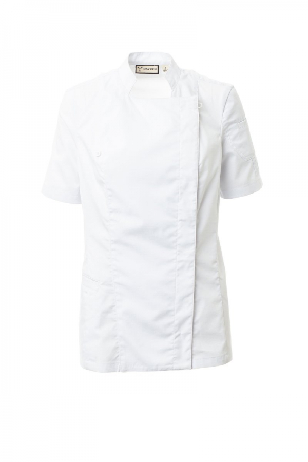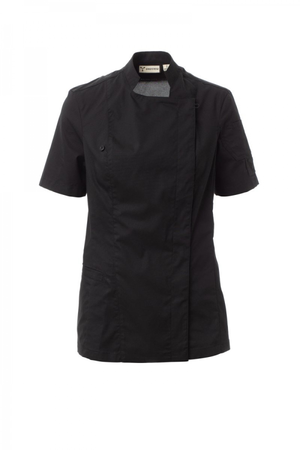 Kochjacke für Damen aus Baumwoll-Ripstop und Lycra® T400®, Mandarinkragen, hervorragende elastische und atmungsaktive Eigenschaften, zur Verbesserung der Atmungsaktivität Rückenbereich aus angenehmem Mesh-Gewebe. Vorne überlappend mit Druckknopfleiste, Revers, das offen mit einem sichtbaren Knopf auf Brusthöhe befestigt werden kann, wodurch die Optik eines innovativen V-Ausschnitts entsteht. Kurzarm mit Saum. Ikonischer Aufnäher auf der linken Schulter mit gesticktem Propeller Ton-in-Ton und Stifthalter. Praktische Smartphonetasche an der Taille.