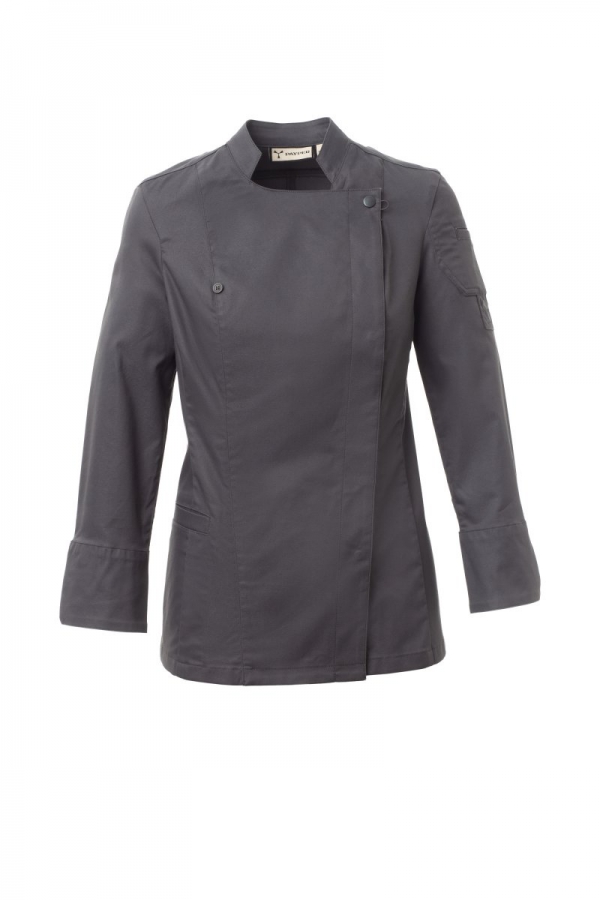 Kochjacke für Damen aus Baumwolltwill und Lycra® T400®, Mandarinkragen, hervorragende elastische und atmungsaktive Eigenschaften. Vorne überlappend mit Druckknopfleiste, Revers, das offen mit einem sichtbaren Knopf auf Brusthöhe befestigt werden kann, wodurch die Optik eines innovativen V-Ausschnitts entsteht. Langarm, Manschette mit sichtbarem Druckknopf. Ikonischer Aufnäher auf der linken Schulter mit gesticktem Propeller Ton-in-Ton und Stifthalter. Praktische Smartphonetasche an der Taille. Vertikale Schlitze im unteren Rückenbereich für mehr Bewegungsfreiheit.