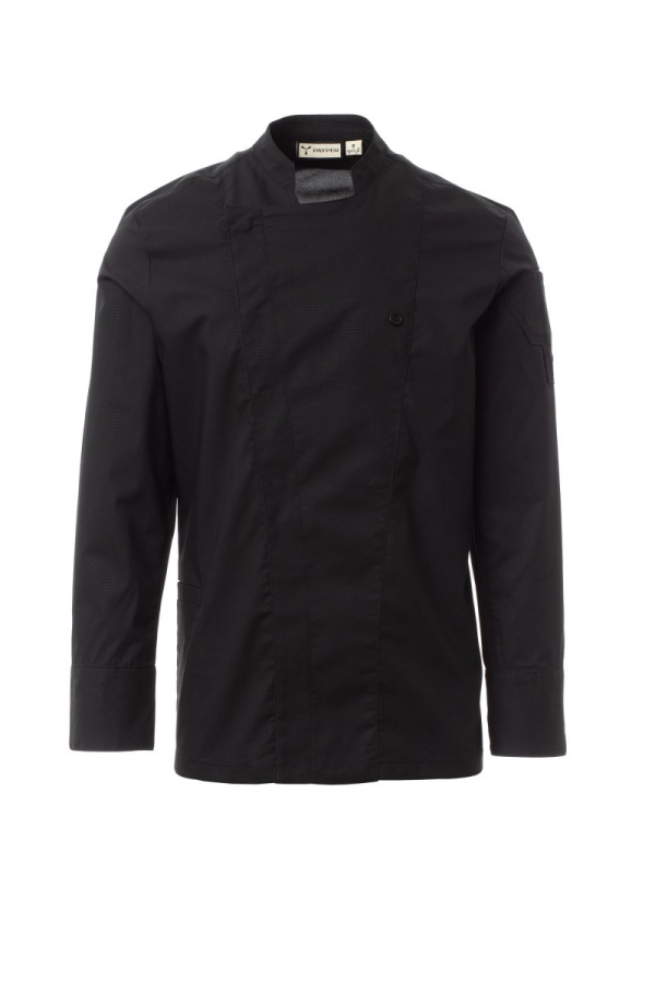 Kochjacke für Herren aus Baumwoll-Ripstop und Lycra® T400®, Mandarinkragen, hervorragende elastische und atmungsaktive Eigenschaften, zur Verbesserung der Atmungsaktivität Rückenbereich, Innenarm und Achselbereich aus angenehmem Mesh-Gewebe. Vorne überlappend mit Druckknopfleiste, Revers, das offen mit einem sichtbaren Knopf auf Brusthöhe befestigt werden kann, wodurch die Optik eines innovativen V-Ausschnitts entsteht. Langarm mit Hemdmanschette, sichtbarer Druckknopf. Ikonischer Aufnäher auf der linken Schulter mit gesticktem Propeller Ton-in-Ton und Stifthalter. Praktische Smartphonetasche an der Taille.