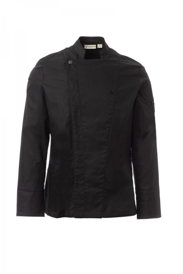 Kochjacke für Herren aus Baumwolltwill und Lycra® T400®, Mandarinkragen, hervorragende elastische und atmungsaktive Eigenschaften. Vorne überlappend mit Druckknopfleiste, Revers, das offen mit einem sichtbaren Knopf auf Brusthöhe befestigt werden kann, wodurch die Optik eines innovativen V-Ausschnitts entsteht. Langarm mit Umschlagmanschette, zur Verbesserung der Atmungsaktivität Mesh-Gewebe im Achselbereich. Ikonischer Aufnäher auf der linken Schulter mit gesticktem Propeller Ton-in-Ton und Stifthalter. Praktische Smartphonetasche an der Taille. Vertikale Schlitze im unteren Rückenbereich für mehr Bewegungsfreiheit.