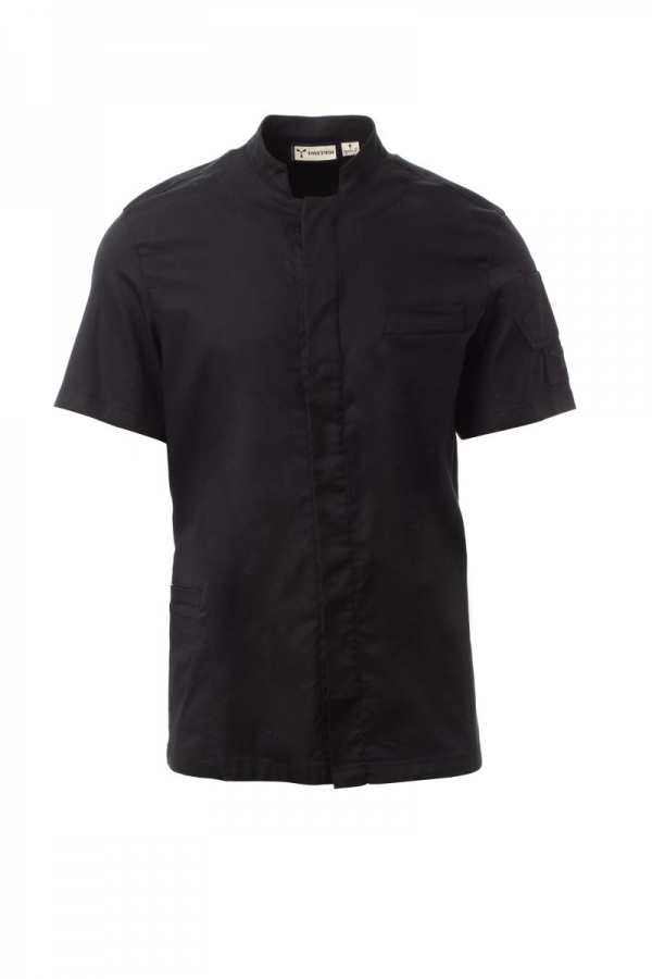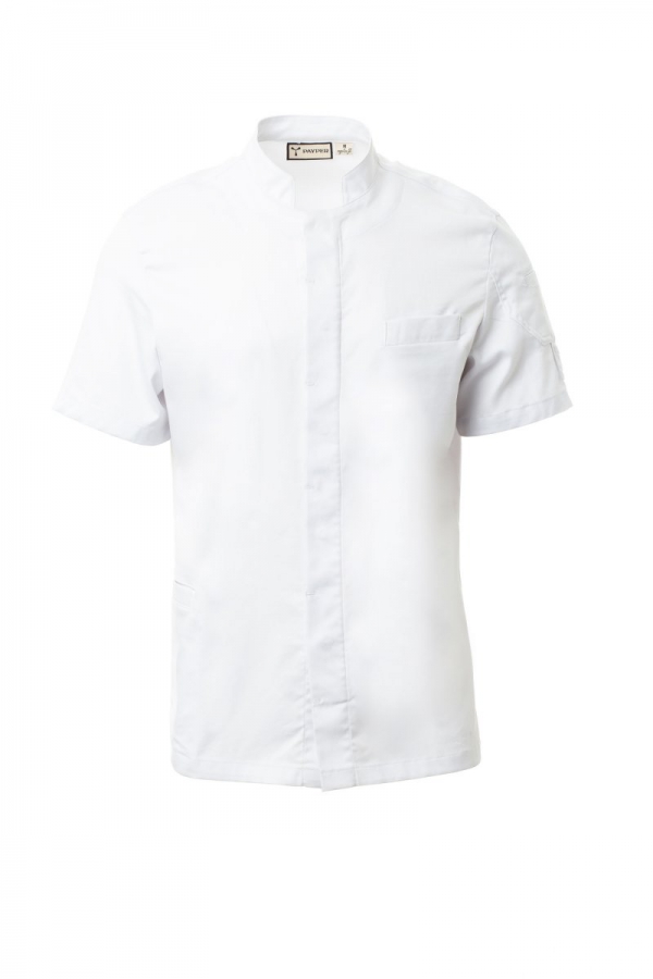Kochjacke für Herren aus Baumwolltwill und Lycra® T400®, Mandarinkragen, hervorragende elastische und atmungsaktive Eigenschaften. Mittige Druckknopfleiste. Kurzarm mit Saum, zur Verbesserung der Atmungsaktivität Mesh-Gewebe im Achselbereich. Ikonischer Aufnäher auf der linken Schulter mit gesticktem Propeller Ton-in-Ton und Stifthalter. Brusttasche und praktische Smartphonetasche an der Taille. Vertikale Schlitze im unteren Rückenbereich für mehr Bewegungsfreiheit.